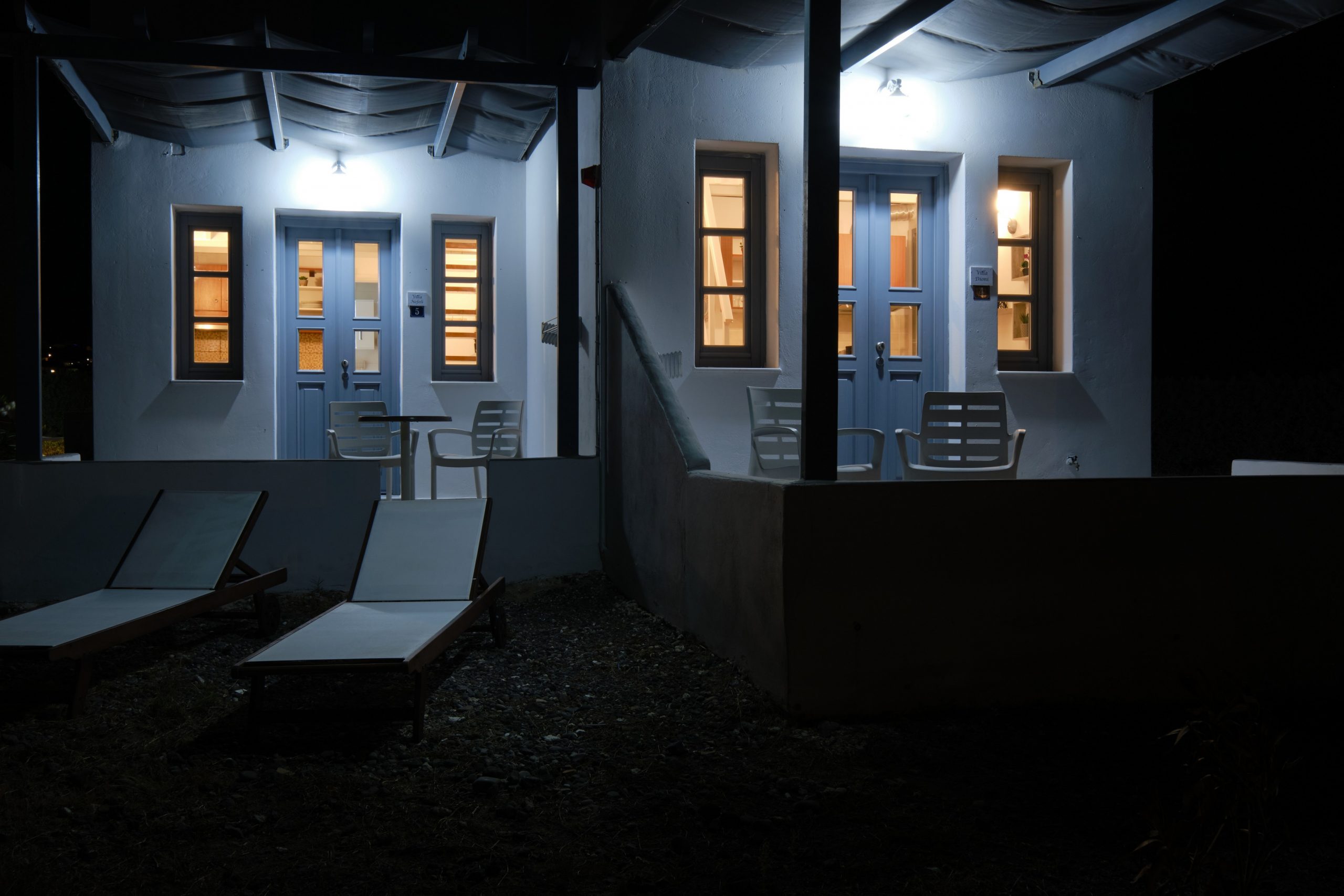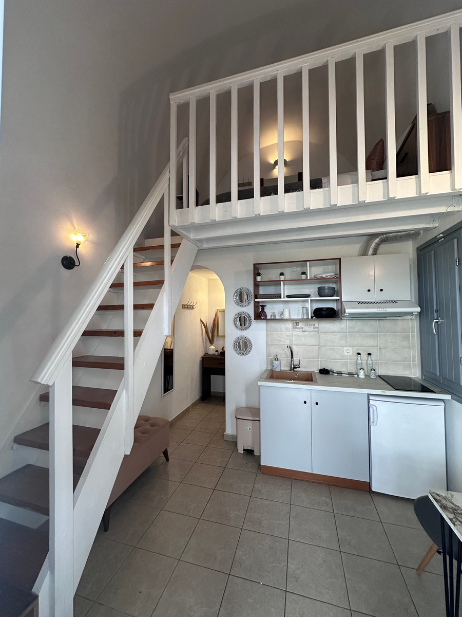 It is 25 sqm bungalow in Santorini for 2 people. It has a bedroom upstairs with a domed selling , a kitchenette with all the essentials utensils and private bathroom .Has a nice open terrace and access to the outdoor courtyard. View of the beautiful waters of the Aegean and the wild scenery of nature with black pebbles and light stone created from the famous volcano .All the bungalows has access to the pool.